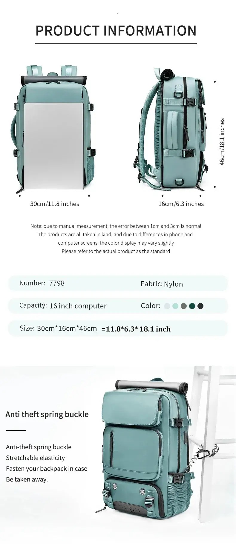 Backpack size: 18.1X11.8X6.3 inch (46*30*16CM)